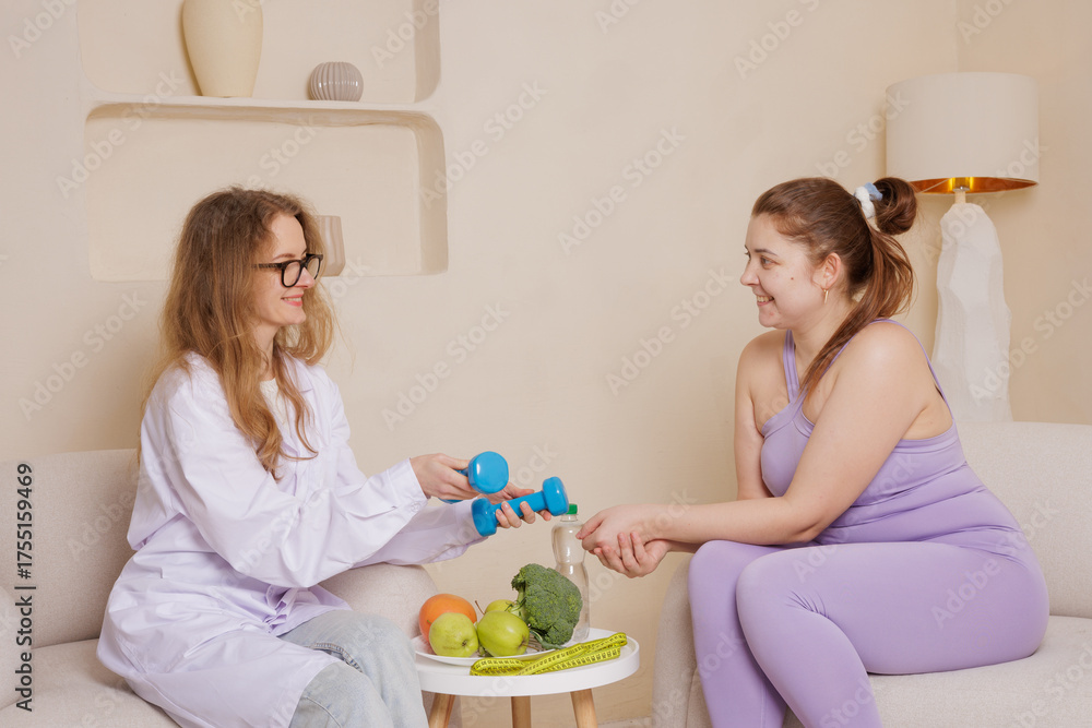 Dietitian coaching plus size woman with dumbbells and healthy food consultation at home