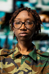 Closeup portrait of soldier in front of command center screens used for surveillance and threat monitoring. African american officer oversees mission control with displays showing intelligence feeds