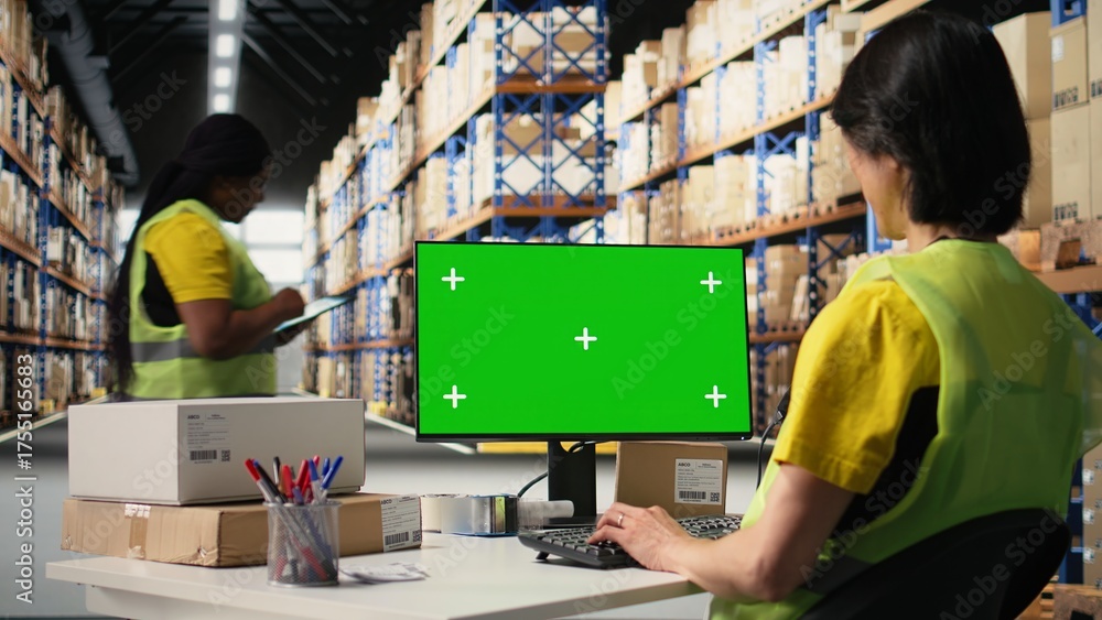 Asian staff looking at isolated screen shipping route on package tracking software, updating the delivery details on airway bills. Works in warehouse with green screen on computer. Camera A.