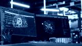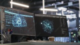 Close up of server farm PC screens tracking rackmounts processing deep learning datasets. Computer displays monitoring gear used in artificial intelligence model development, handheld camera shot