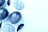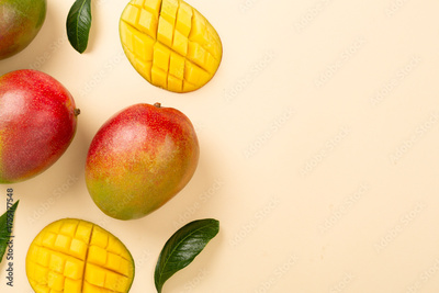 Flat lay with mango on color background, top view