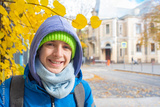 Portrait of a 13-year-old boy in a jacket with a backpack in the city in autumn