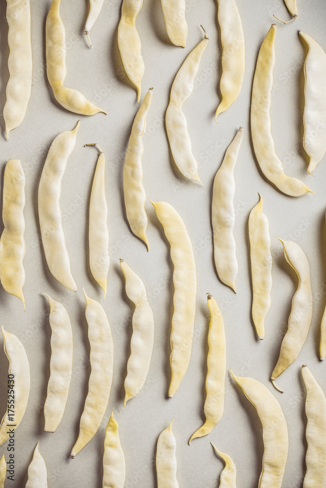 Yellow french beans background overhead group vertically lined up on paper background in studio