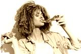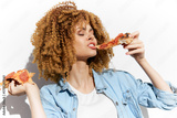 Young woman enjoying slices of pizza with curly hair, wearing a denim shirt and expressing joy against a bright, minimalistic background