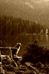 A Nova Scotia Duck Tolling Retriever gazes at a mountain lake surrounded by pine trees and autumn foliage. The natural setting creates a tranquil and picturesque scene.