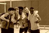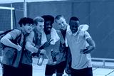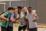 Diverse male friends posing for selfie on volleyball court with smartphone, volleyball