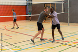 Diverse male partners exchanging high five at net inside gymnasium during volleyball match