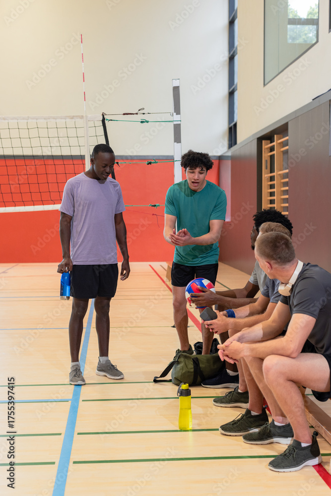 Diverse male teammates gathering beside volleyball net in gym holding water bottles, volleyballs