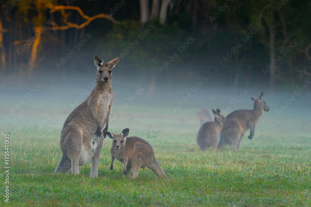 Kangaroo in field with juvenile