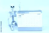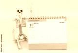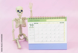 October month on calendar and human skeleton on pink background. Halloween celebration concept.