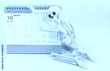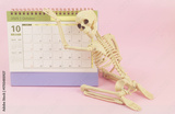 October month on calendar and human skeleton on pink background. Halloween celebration concept.