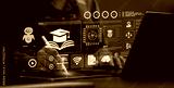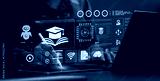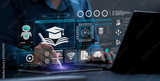 AI Artificial Intelligence and Education technology concept. A man use laptops, Learn lessons and online webinars successfully in modern digital learning, Courses to develop new skills. E-learning.