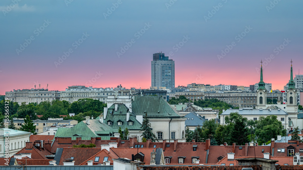 A panorama of Warsaw. A beautiful pink sky on the horizon. Roofs covered with ceramic tiles and copper sheets. The capital of Poland.
