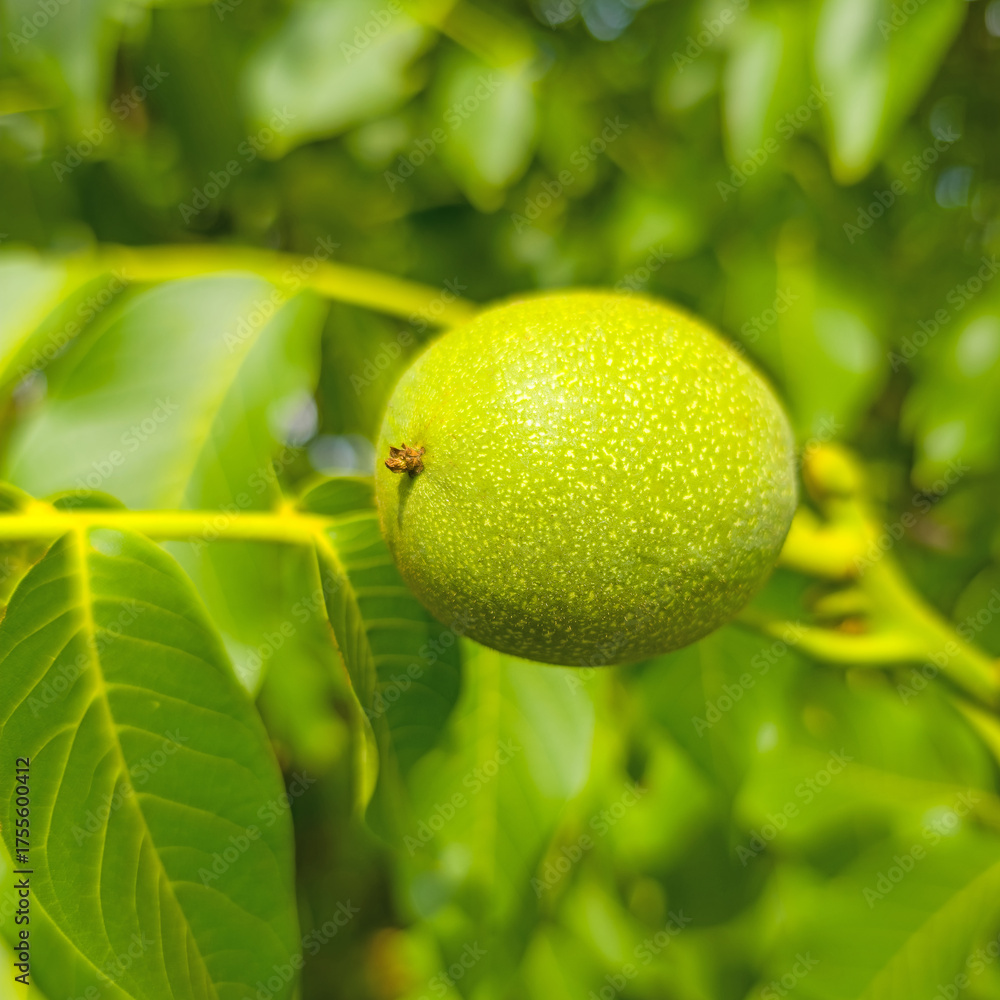 Grüne Walnuss am Baum in einer Nahaufnahme