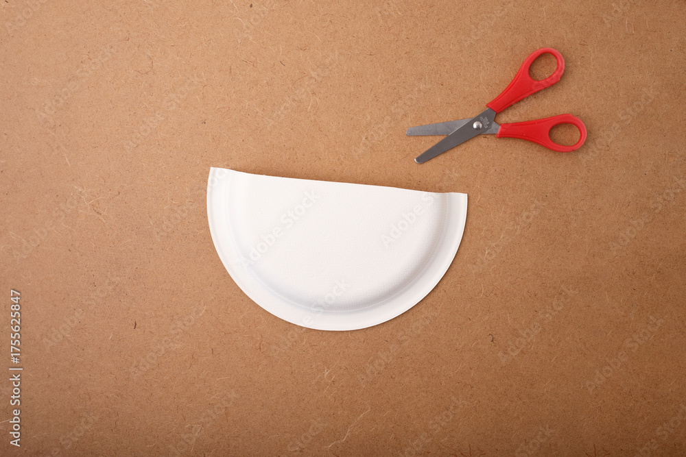 Halved paper plate with scissors on surface, perfect for craft supply stores, educational publishers, parenting blogs, online tutorials, kindergarten branding,