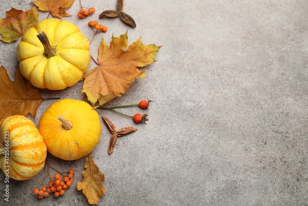 Dry autumn leaves, pumpkins and berries on grey table, flat lay. Space for text