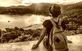 Young beautiful woman hipster traveler looking at sunset and beautiful seascape with a lookout point. Freedom, travel, vacation