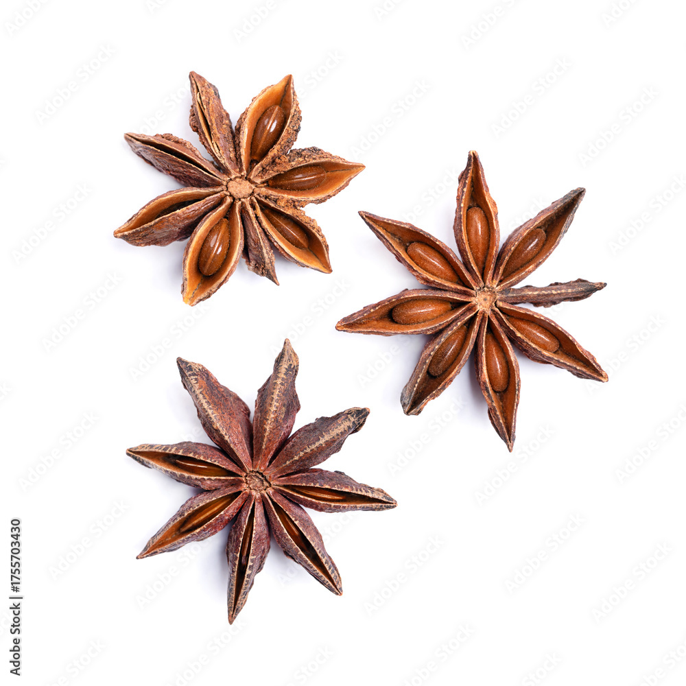 Star anise fruits and seeds, on white background. Illicium verum, also known as badian, Chinese star anise, or star aniseed, a spice that closely resembles anise in flavor. Close-up, from above. Photo