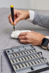 female hands with screwdriver repairing kids toy on grey table. repair shop, focus on screwdriver set