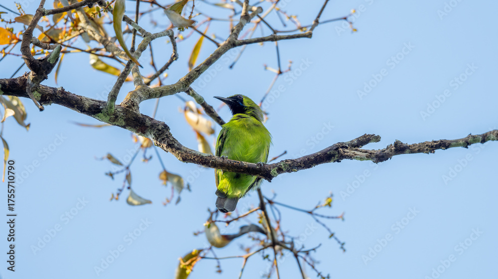 Greater Green Leafbird Perched on a Branch Amidst Lush Greenery