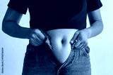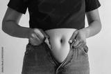 A woman in a black t-shirt and blue jeans trying to pull up her pants, showing stretch marks on her belly. Concept of body changes, postpartum recovery, skin care, and self-acceptance