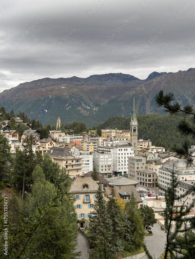 St. Moritz mountain town panorama in swiss alps
