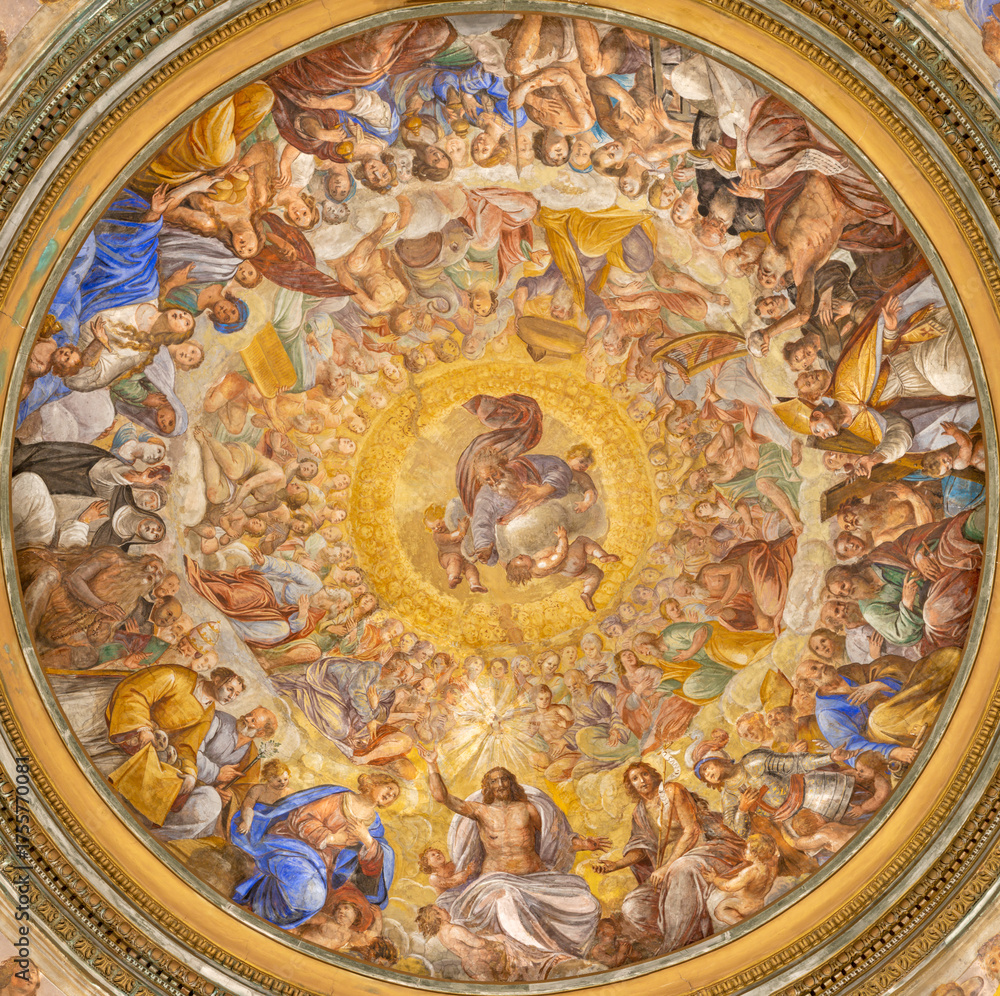 SALERNO, ITALY - OCTOBER 6, 2025: The baroque fresco of “Paradiso Salernitano” - Glory of Holy Trinity among the saints in the church Chiesa di San Giorgio by Angelo Solimena (1674‑1675)