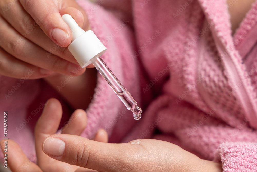 woman in pink bathrobe dropping essential oil on palm hand and holding a pipette closeup