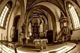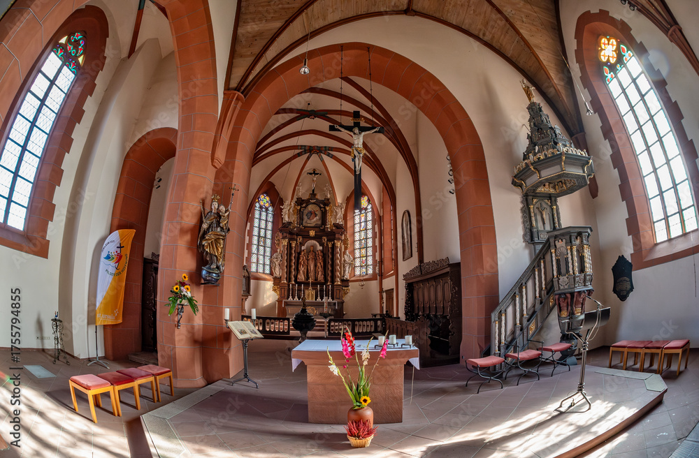 Menschenleerer Innenraum der Kirche St. Ursula in Oberursel, Hessen mit Altar, Altarraum, Apsis, Kanzel und Chor