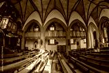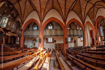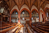 Menschenleerer Innenraum der Kirche St. Ursula in Oberursel, Hessen mit Kirchenbänken, Haupt- und Seitenschiff