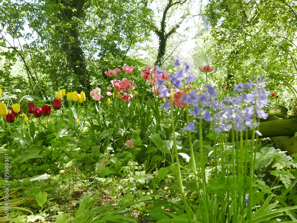 wild flowering Tulips in a garden with trees and schrubs