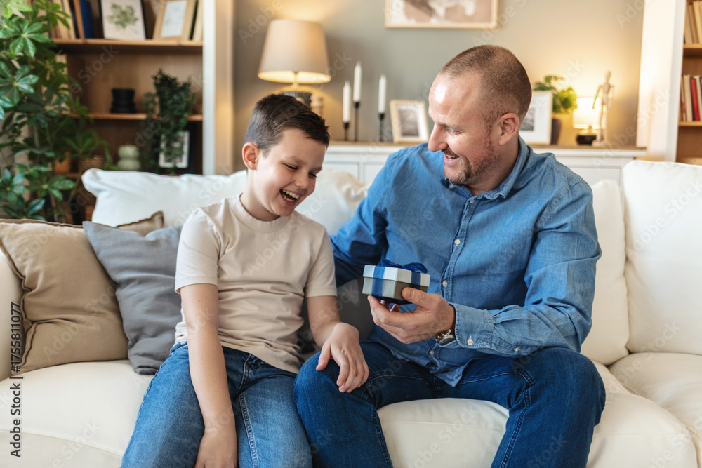 Excited cute kid receiving surprise gift from father while sitting on sofa at home - concept of relationship, fatherhood and affectionate.