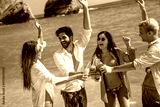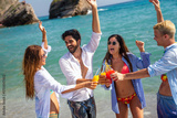 Group of young friends enjoying summer beach vacation with drinks on a tropical coastal destination