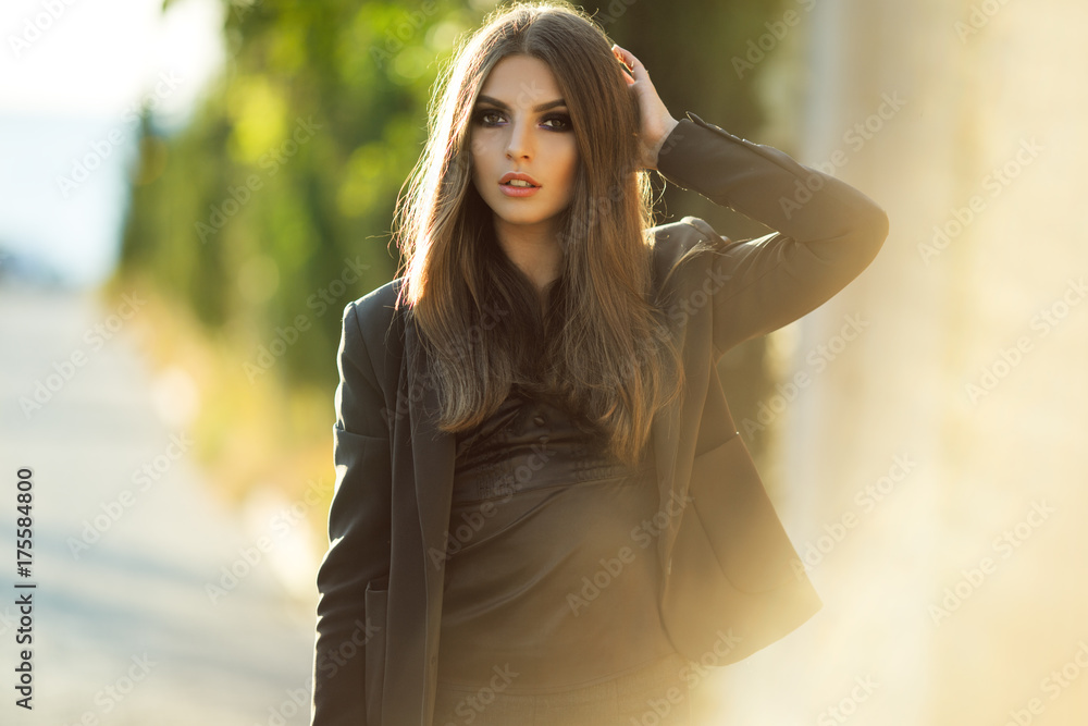 Portrait of pretty serious business woman is wearing black official clothes near wooden wall over sunset lights