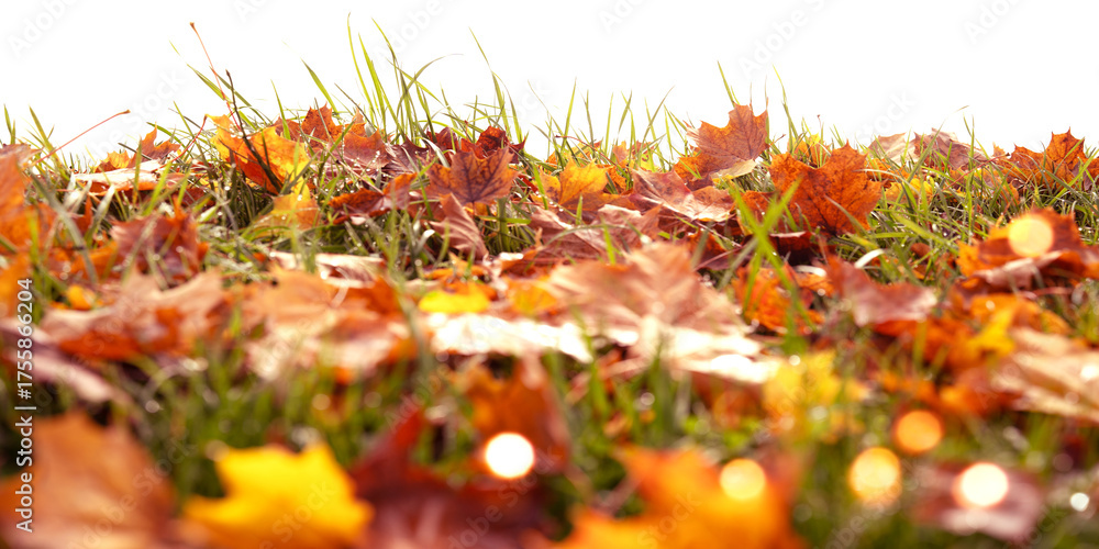 Colorful autumn leaves on a meadow with white isolated background. Glowing colored autumn leaves with golden bokeh, suitable for seasonal nature backgrounds.