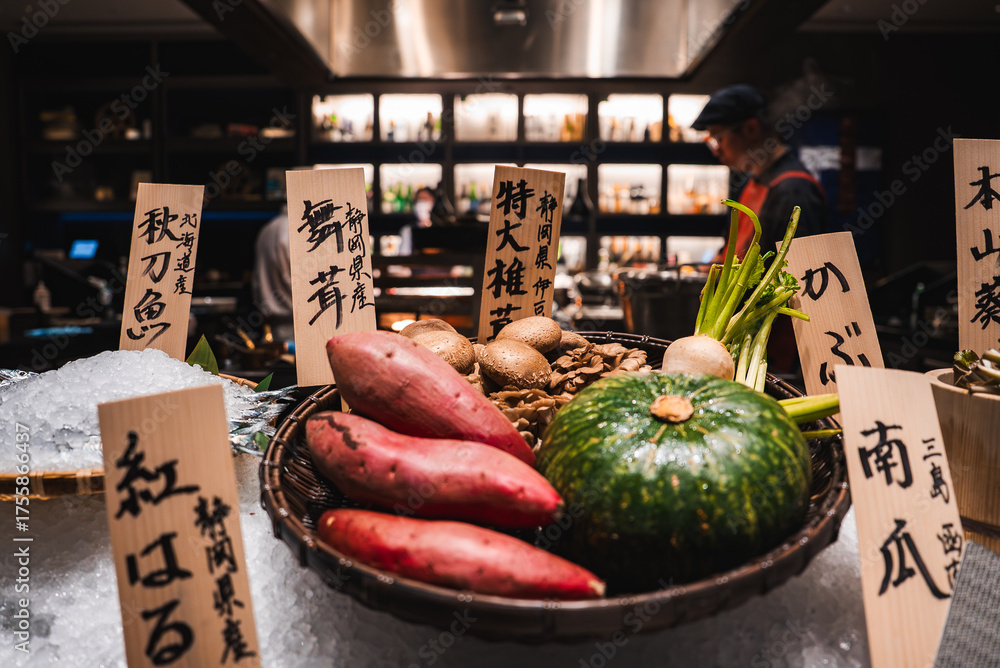 A Japanese restaurant kitchen counter shows kabocha, sweet potatoes, mushrooms, lotus root, and spring onions on ice with kanji placards, chefs working in the blur.