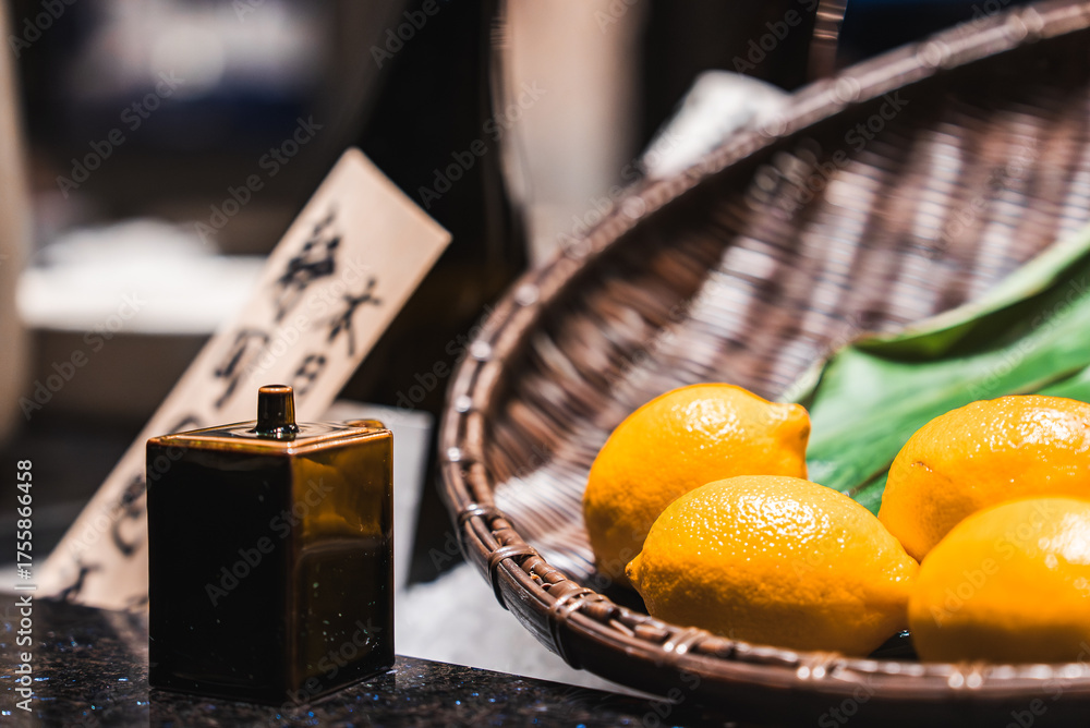 Wicker basket of yellow yuzu or lemons sits beside a square lacquered dispenser on a glossy counter in Japan. Warm light highlights citrus texture and polished surfaces.