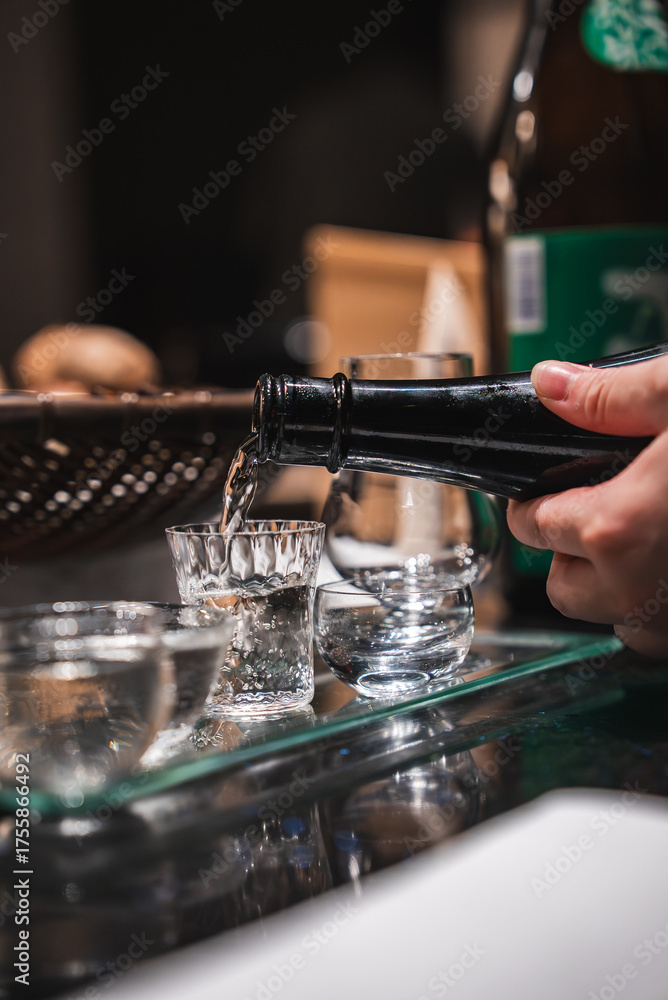 A hand pours clear sake from a black bottle into glass ochoko cups on a reflective tray in a Japanese hotel bar or restaurant, with warm light and shallow focus.