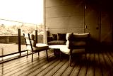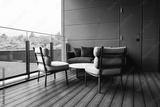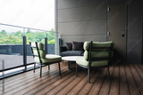 Mint chairs, round table, and dark curved sofa on wood decking in Japan. Glass railing shows rooftops and plants. Soft daylight and clean lines suggest quiet luxury.