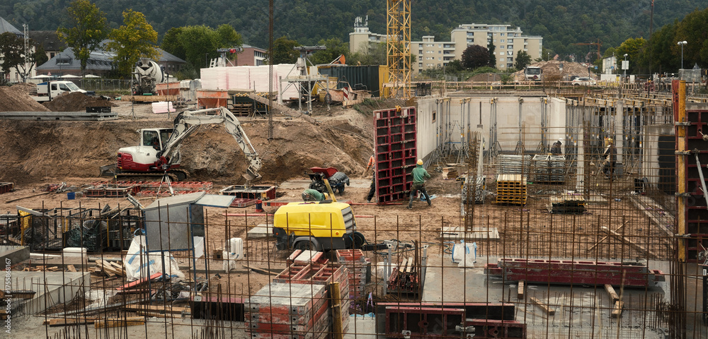 Construction site with workers in action, no logos, no faces. Overcast soft light with warm earthy colors.