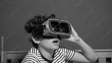 Little boy Immersed in cyberspace, metaverse, learning in virtual reality. Kid playing games. Child learning using virtual reality headset. Education child in virtual reality glasses. laptop and globe