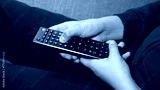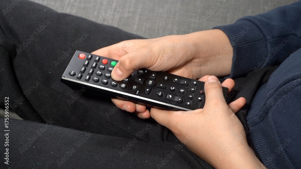 Happy 10 year old boy watches TV sitting on the sofa at home changing programs with the remote control - childhood television addiction and zapping