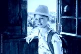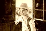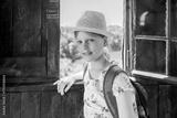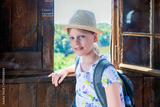 Smiling girl in straw hat and backpack standing by rustic wooden window with scenic lake and forest view, summer travel and sightseeing portrait outdoors
