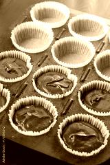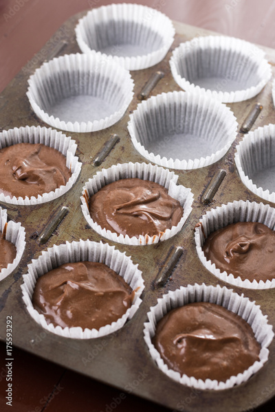 Raw chocolate cup cakes mixture in the cup cakes papers ready for baking