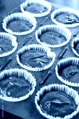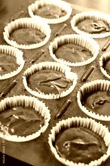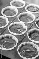 Raw chocolate cup cakes mixture in the cup cakes papers ready for baking