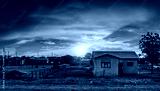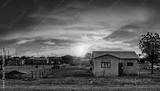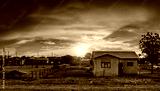 african village , rural life in Botswana typical houses, sunset with dramatic sky