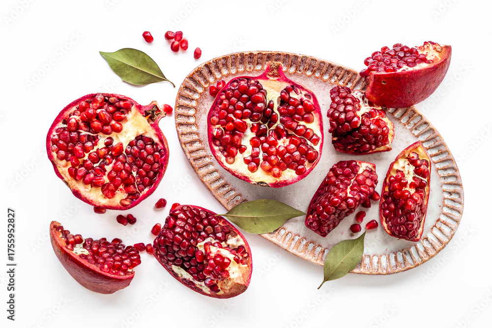 Top view of fresh ripe pomegranate and pieces on plate for eating, top view.
