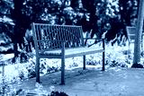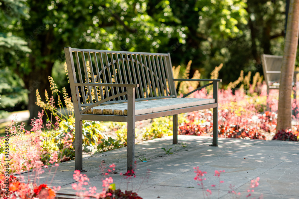 Metal garden bench among blooming flowers in sunlit park, tranquil outdoor seating area for relaxation, nature, leisure, and summer travel in public space, Swieradow-Zdroj, Poland
