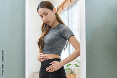 Excess weight gain, overweight asian young woman touching stomach wearing fit body clothes, dissatisfied about her body shape from fat around waist. Obese getting belly fat, diet, weight loss concept