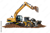 Heavy machinery is actively engaged in earth moving at a construction site, with an excavator digging and a loader transporting materials.